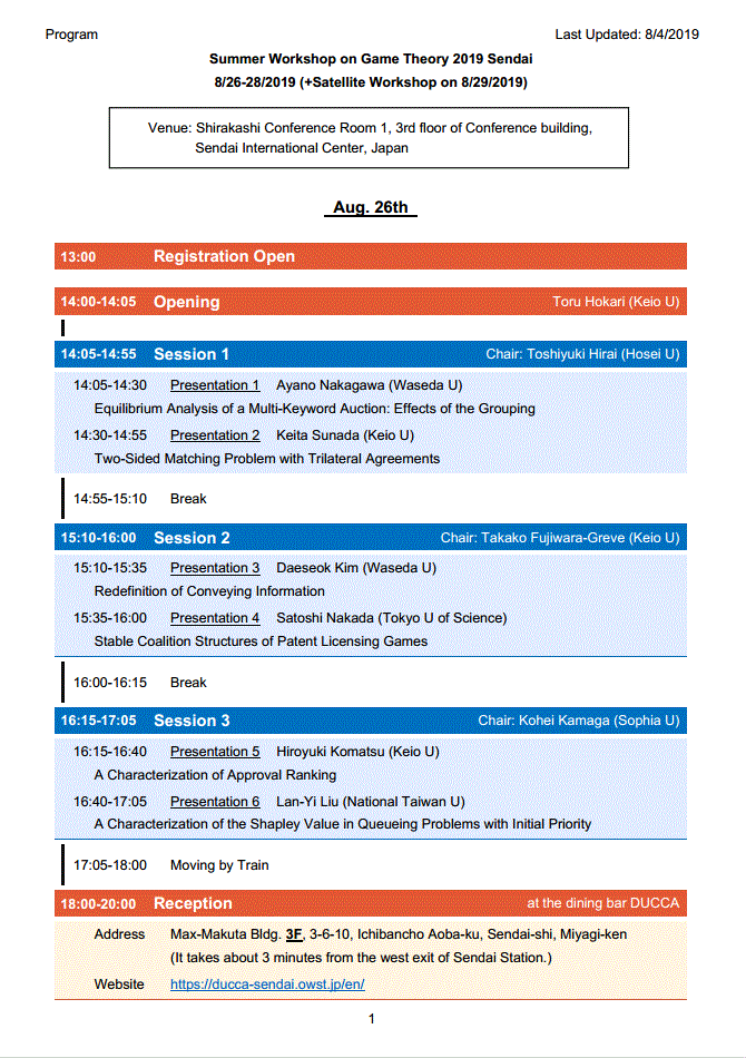 Summer Workshop on Game Theory 2019 Sendai 8/26~28/2019(+Satellite Workshop on 8/29/2019)